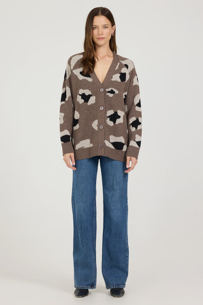 Add a bold twist to your layering game with this abstract leopard-print cardigan, crafted from a refined blend of 47% merino wool, 38% viscose, 10% nylon, and 5% cashmere. Designed with a relaxed fit, deep V-neckline, and front button closure, this cozy knit is perfect for effortless styling. Ribbed cuffs and hem add structure while enhancing comfort. A standout piece with luxurious softness and contemporary flair.