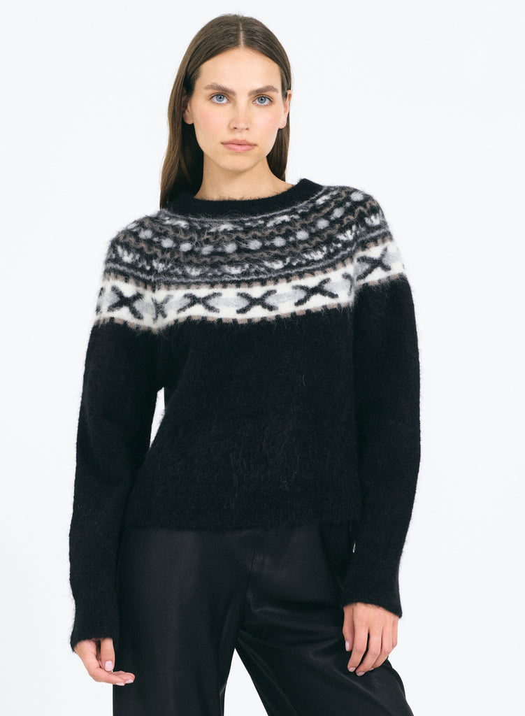 The Cecilia Pullover brings a fresh, elevated take to classic fair isle. Knit from a blend of Merino wool and cashmere, it features a soft brushed texture and striking tonal black, white, and grey. With its cozy feel and bold pattern, this relaxed pullover adds a touch of winter charm to any outfit.