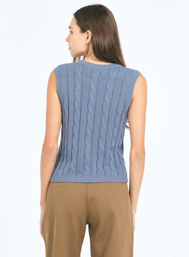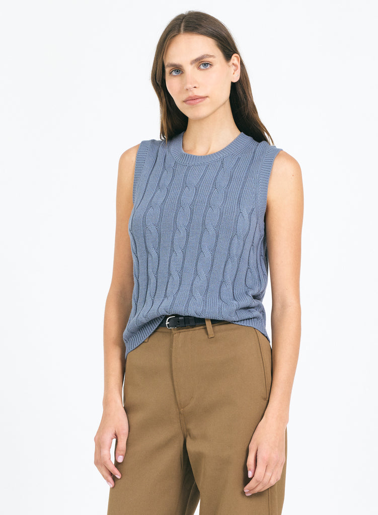 Expertly crafted for comfort and style, the Raleigh Cable Sleeveless Tee has a cable stitch and a loose-tension fit that provides a relaxed yet polished look. The soft cotton-blend yarn guarantees a cozy feel while the boxy shape and cable stitch add a touch of sophistication. Pair it back with the Raleigh Cable Cardigan or Pullover to complete the look.