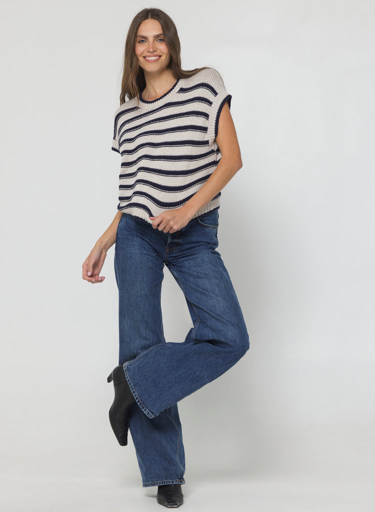 The Vivian Vest brings flair to classic knitwear with its clean, structural design. Made from a soft blend of cotton, silk, and nylon, it is a fresh take on a classic stripe. Perfect for layering or wearing solo for an easy, styled look.