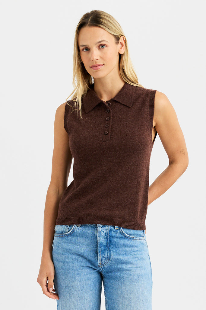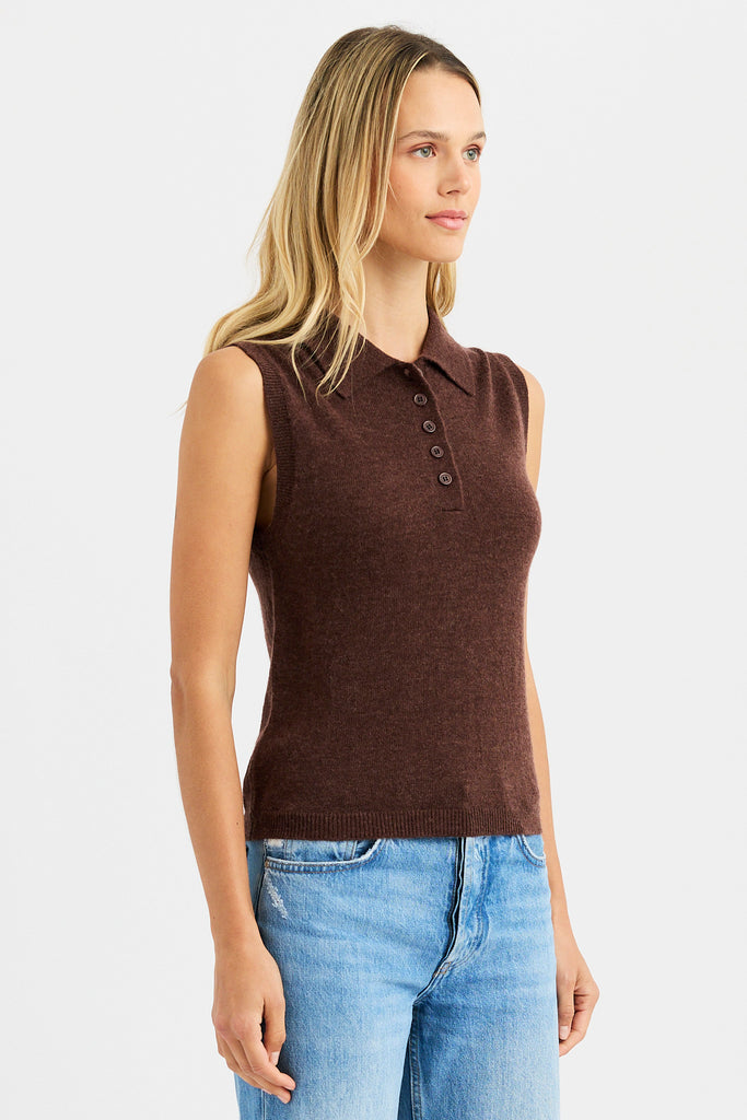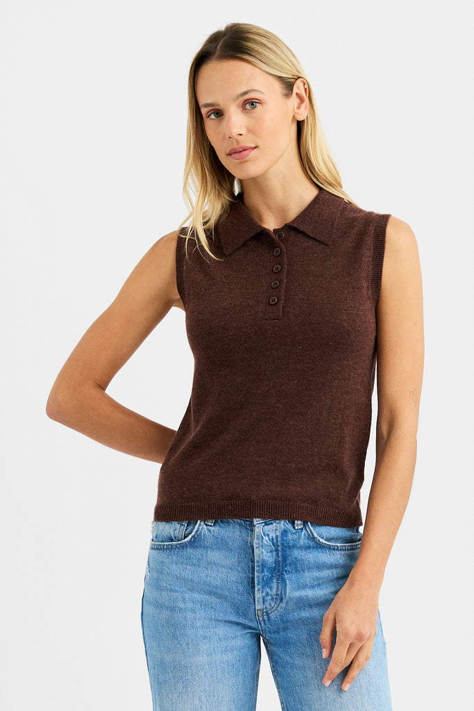 The Drew Polo, a refined staple with a soft edge, is a sleeveless polo is knit from a luxurious blend of alpaca and merino wool for a featherlight feel and natural warmth. The classic polo collar adds structure, while the sleeveless silhouette offers a modern, transitional layer perfect for all seasons.