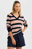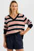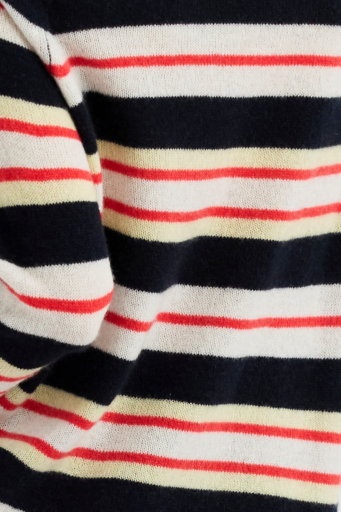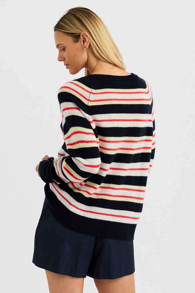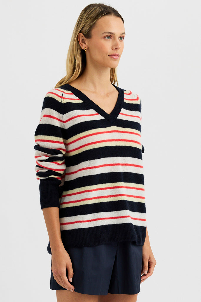 An Everyday lightweight v-neck in our loose knit cashmere, with a slightly boxy fit. Featuring fashioning and seam details on the shoulders and a stitch detail down the center back. Now in our updated citrus stripe pattern!