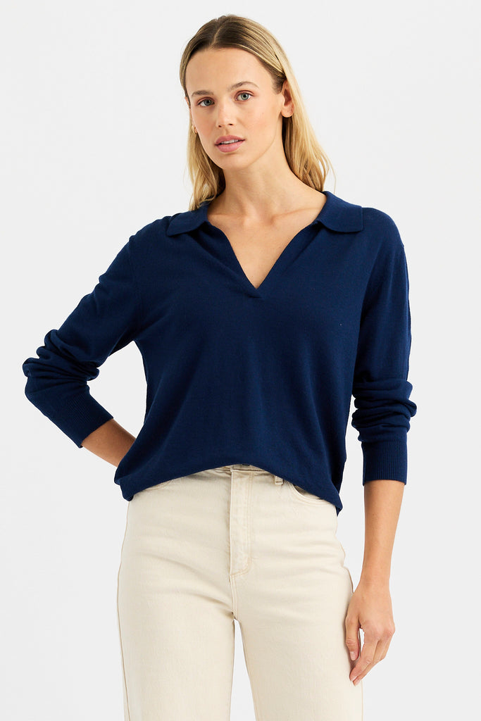 Our streamlined staple the Selena Polo, is made of a merino wool blend, and features a clean, buttonless placket for a modern, minimal look. Crafted from a fine-gauge knit, it offers lightweight warmth, natural breathability, and a smooth, polished feel against the skin. Finished with a tailored collar and subtle ribbed trims, it’s a versatile piece that transitions effortlessly from casual to refined.