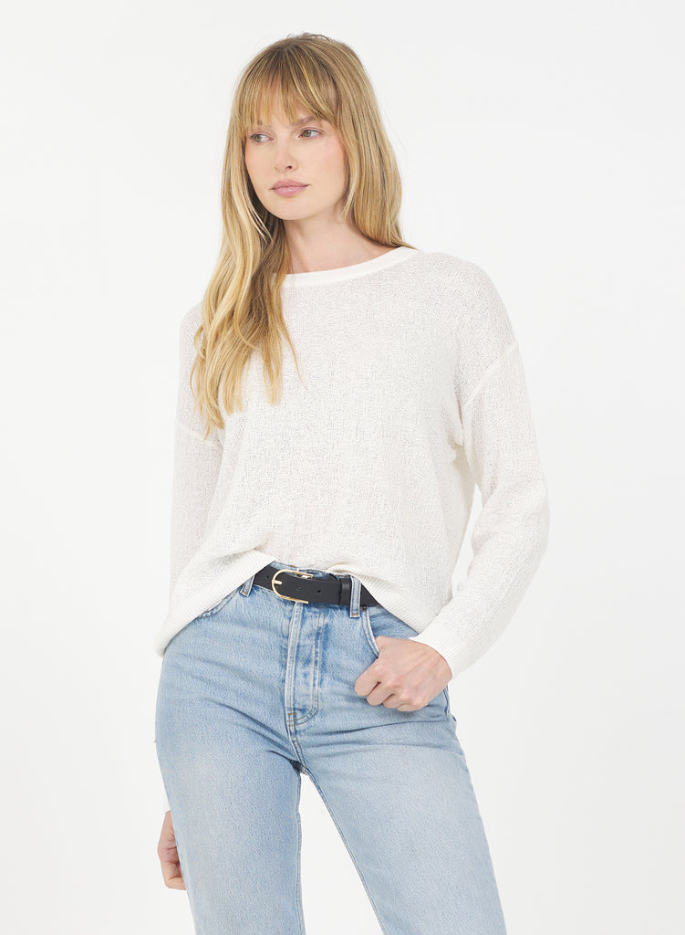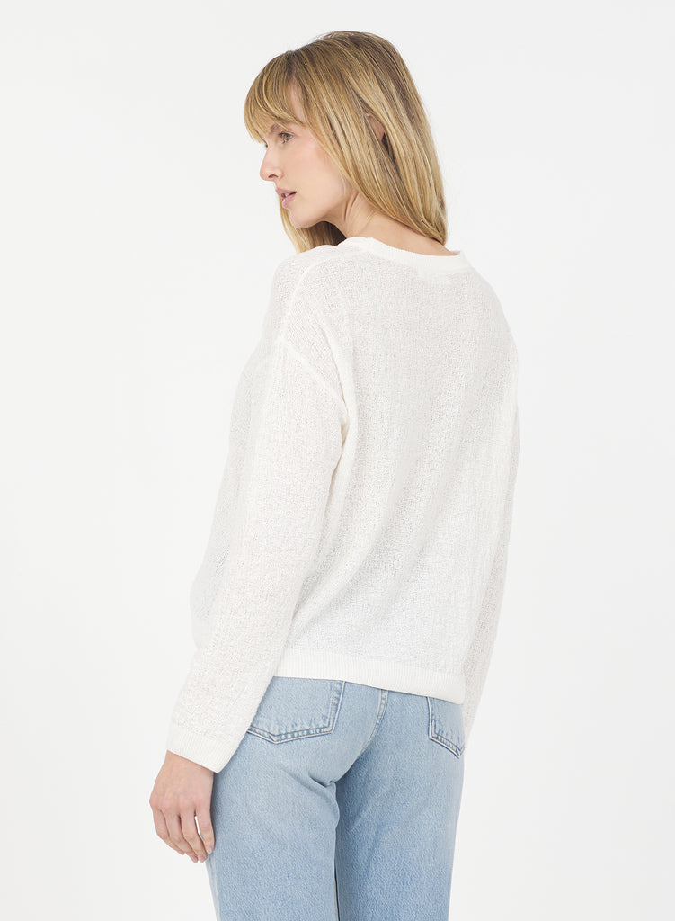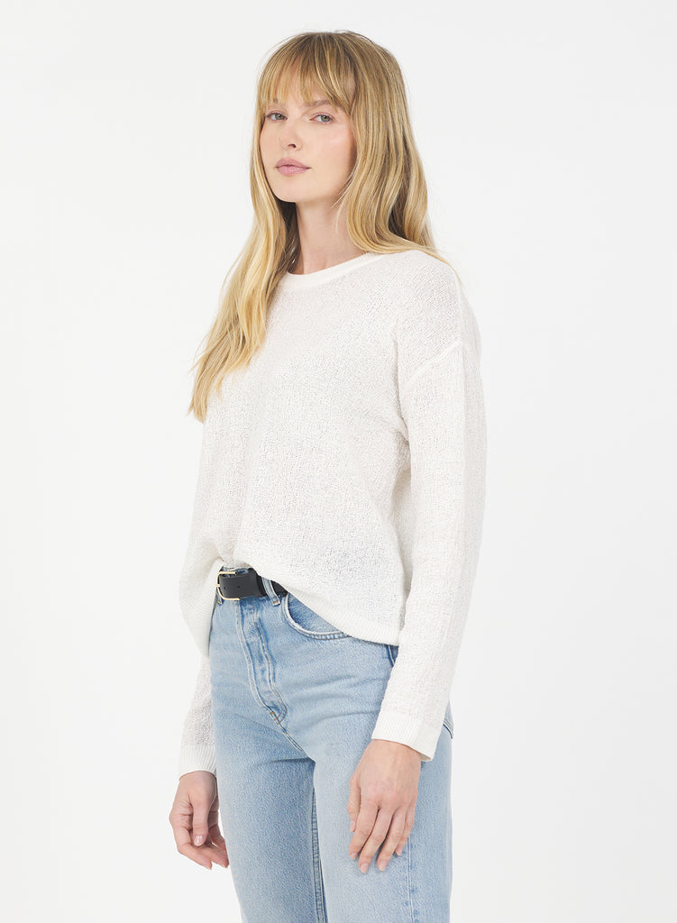 This long sleeve top is knit from a blend of 36% linen, 44% cotton, and 20% polyester yarns with a slub effect for a soft, organic feel with subtle dimension. The lightweight fabric drapes effortlessly, while the clean silhouette makes it easy to style.