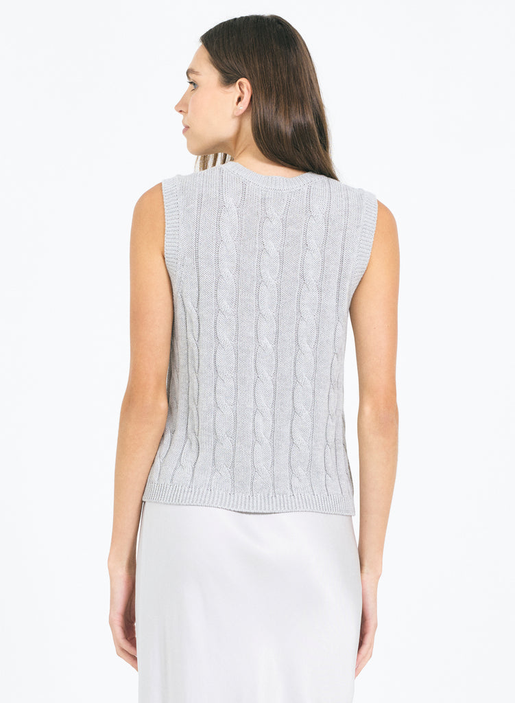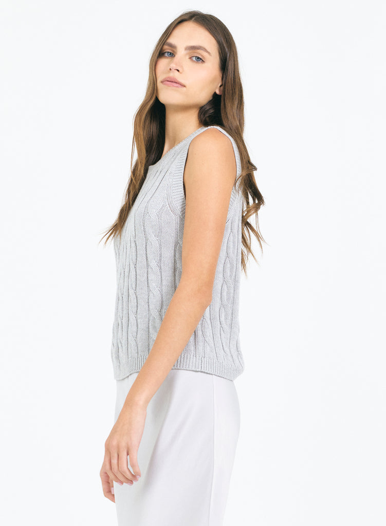 Expertly crafted for comfort and style, the Raleigh Cable Sleeveless Tee has a cable stitch and a loose-tension fit that provides a relaxed yet polished look. The soft cotton-blend yarn guarantees a cozy feel while the boxy shape and cable stitch add a touch of sophistication. Pair it back with the Raleigh Cable Cardigan or Pullover to complete the look.